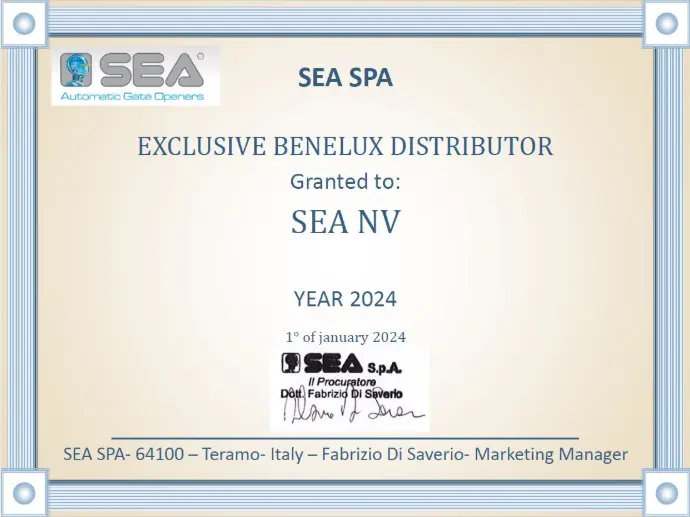 SEA Benelux is trots om de exclusieve distributeur te zijn van het gerenommeerde Italiaanse merk SEA Gate Automation in de Benelux-regio. Dit certificaat, uitgereikt door de SEA-fabriek in Italië, bevestigt onze unieke positie.